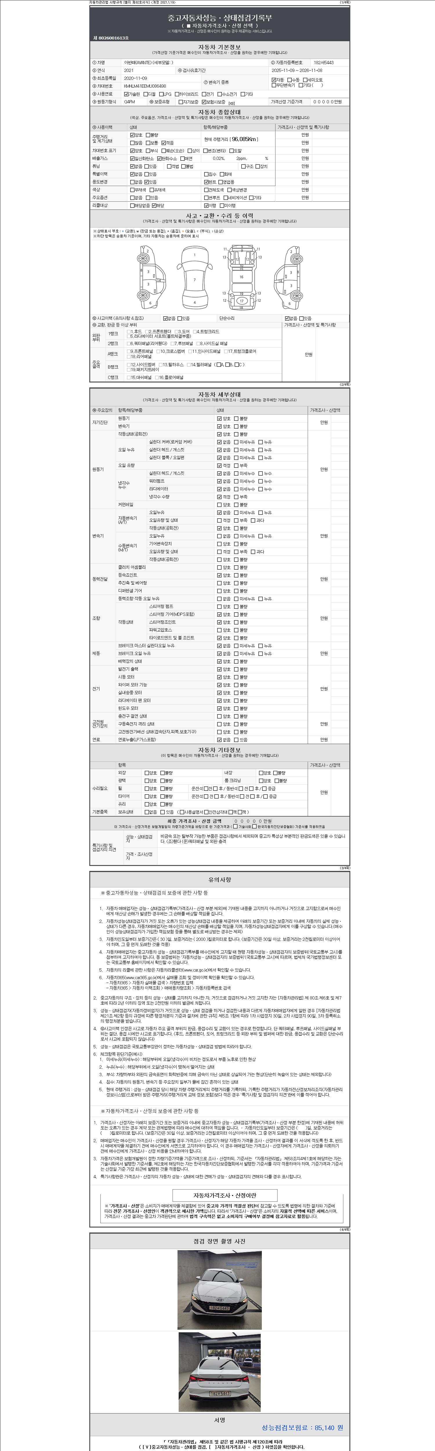 | 주행거리 | 96,085 km | 차량번호 | 182서5443 | 사고유무 | 성능기록부 참조 | 제시번호 | 제 2147483647 호 |