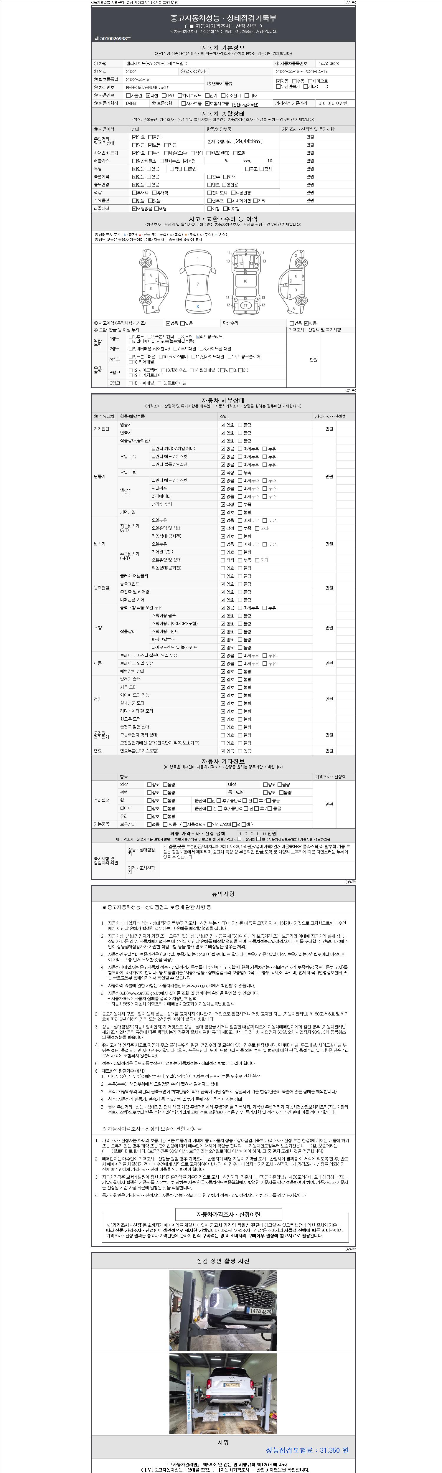 -중고자동차 매매업자를 통해 차량을 구입하실 경우 반드시 "중고자동차 성능, 상태점검 기록부"를 교뷰 받으셔야 하며, 매매업자는 반드시 의무 교부 하여야 압니다.