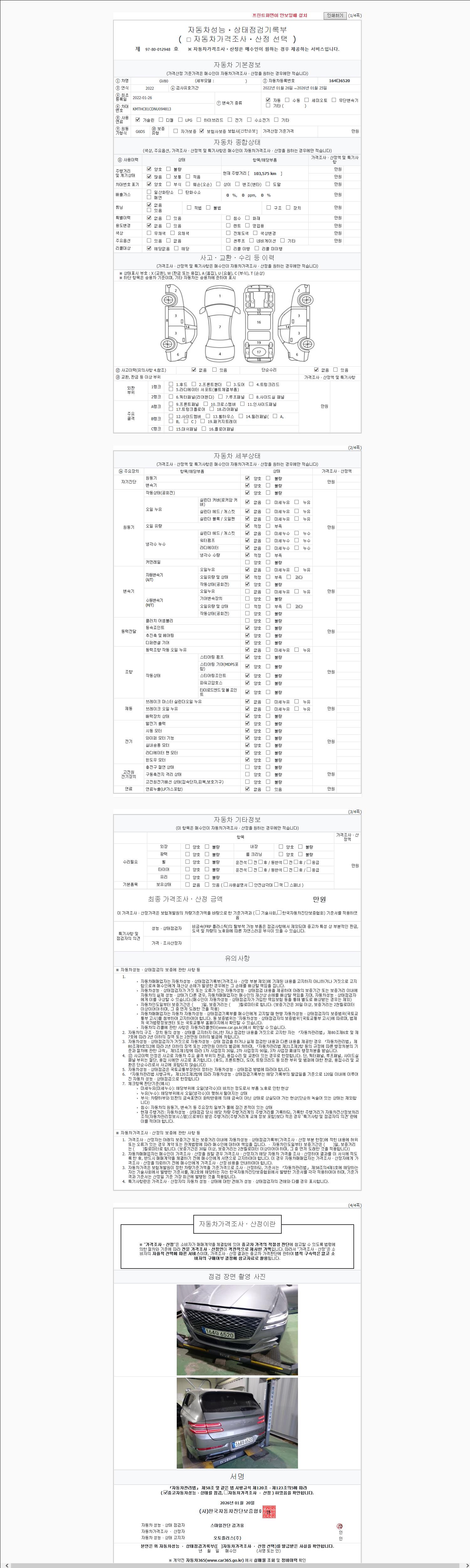 | 주행거리 | 103,575 km | 차량번호 | 164다6520 | 사고유무 | 성능기록부 참조 | 제시번호 | 제 2026001914 호 |