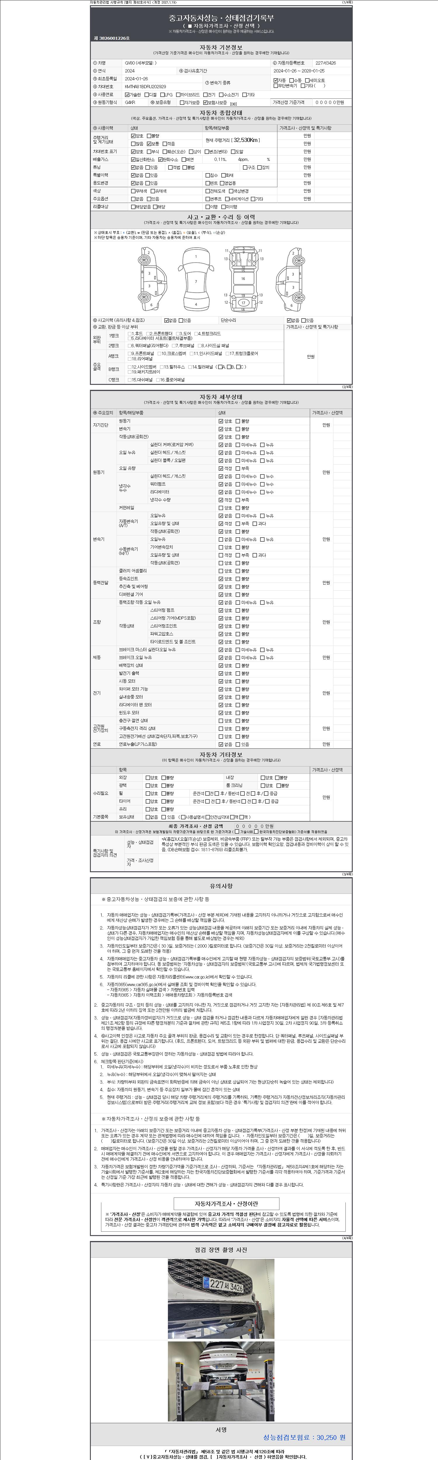 | 주행거리 | 32,530 km | 차량번호 | 227서3426 | 사고유무 | 성능기록부 참조 | 제시번호 | 제 2147483647 호 |