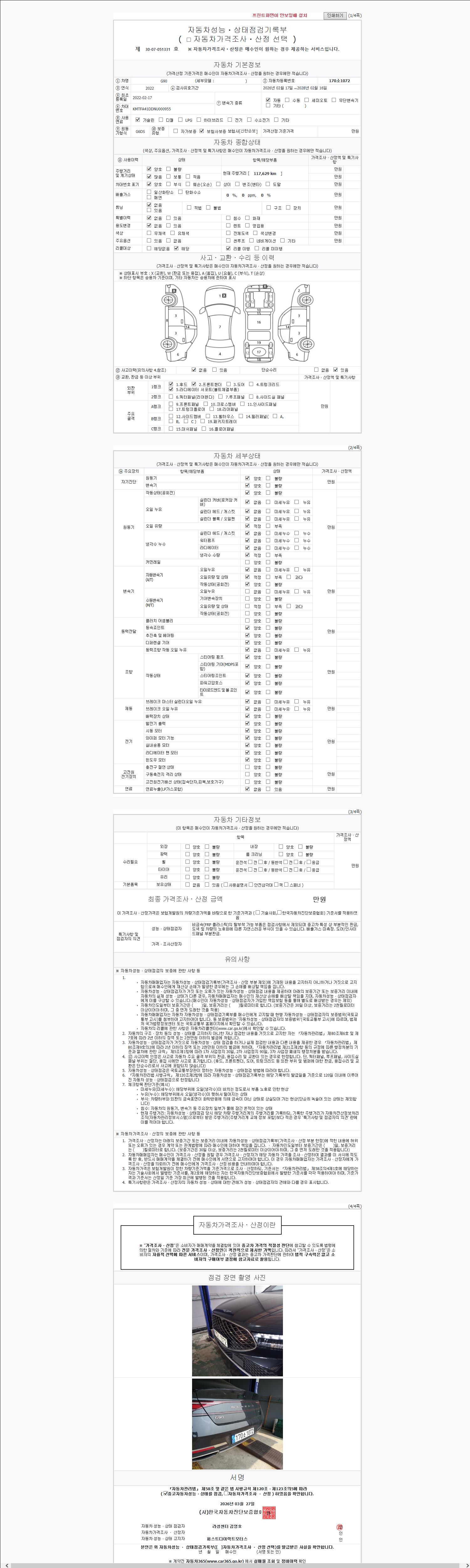 | 주행거리 | 117,629 km | 차량번호 | 170소1072 | 사고유무 | 성능기록부 참조 | 제시번호 | 제 2147483647 호 |