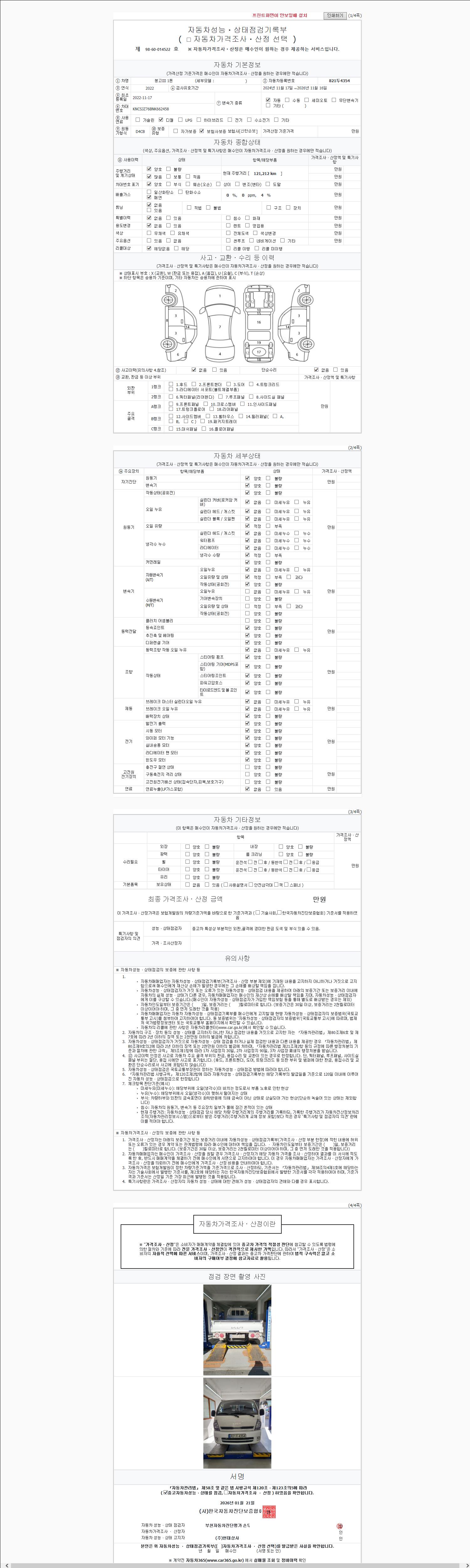 | 주행거리 | 121,212 km | 차량번호 | 821두4354 | 사고유무 | 성능기록부 참조 | 제시번호 | 제 2026004503 호 |