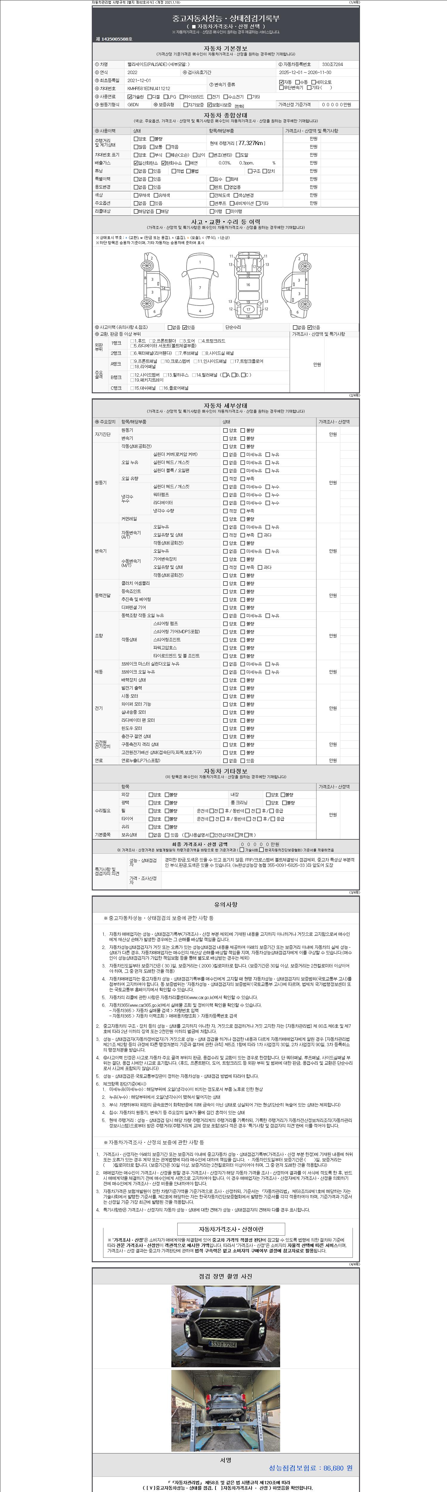 자동차관리법 시행규칙 제120조의 규정에 따라 별지 제 82호서식 《중고자동차 성능, 상태점검 기록부》를 발행한 성능, 상태점검자 및 매매자는 아래의 보증기간 또는 보증거리 이내의 중고자동차, 성능점검 기록부에 기재된 내용과 자동차의 실제 성능, 상태가 다른 경우 계약 또는 관계법령에 따라 매수인에 대하여 책임을 집니다.