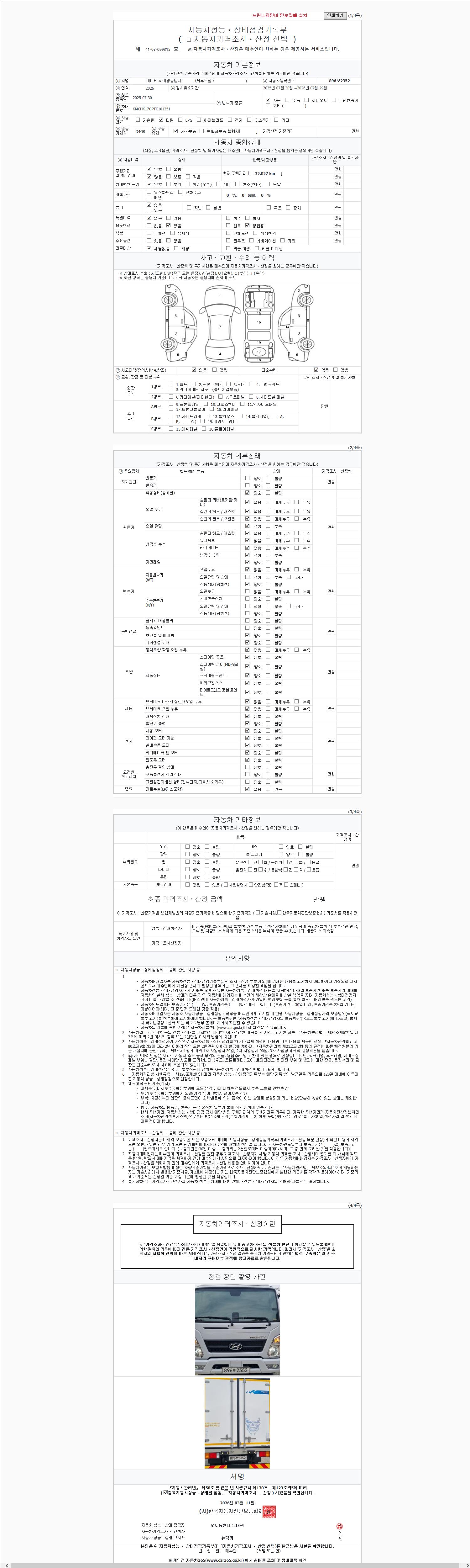 | 주행거리 | 32,027 km | 차량번호 | 896보2352 | 사고유무 | 성능기록부 참조 | 제시번호 | 제 2147483647 호 |